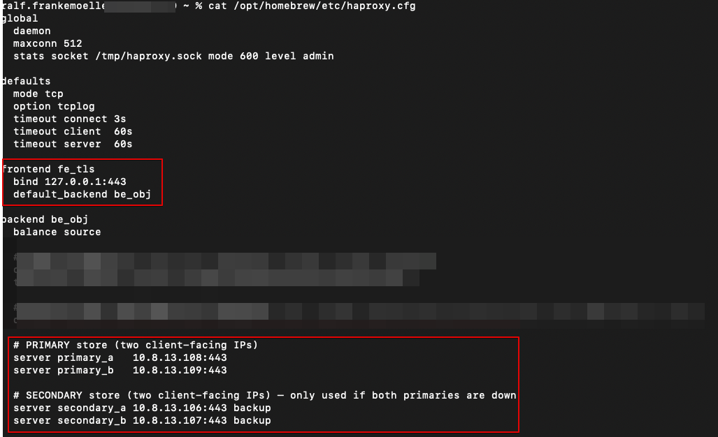 The config is fairly simple: one frontend referring to one backend. The frontend describes the IP and port HAproxy listens on. In this case it is 127.0.0.1:443. As described above, the FQDN rfdemo.prism-central.cluster.local resolves to 127.0.0.1. Since we use HTTPS as the transport for the S3 API calls, requests end up at 127.0.0.1:443. HAproxy then sends them to its backend named “be_obj”. A backend is just a list of IPs or hostnames across which HAproxy can distribute traffic. Here we define primary addresses (the Load Balancer public IPs of rfdemo) and secondary addresses (the Load Balancer public IPs of rfdemo2).